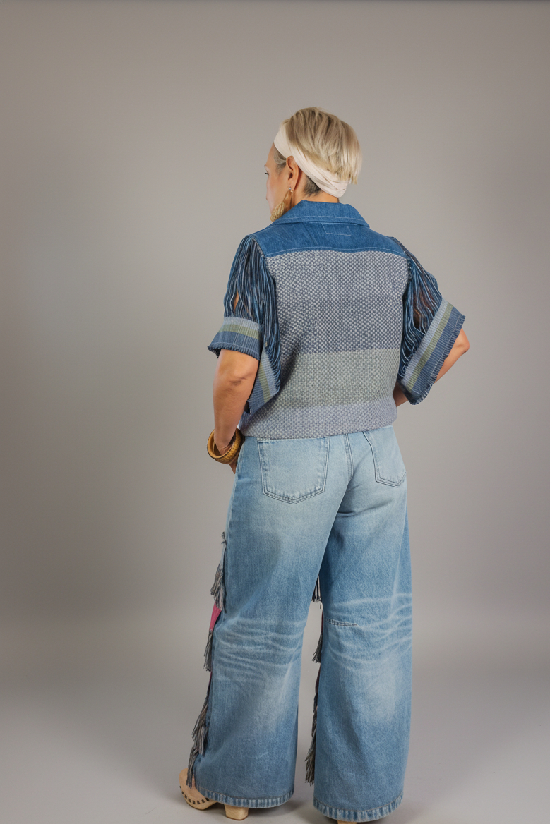 Chamarra corta con cierre al frente y mangas en deshilado y cuello tipo Mao.