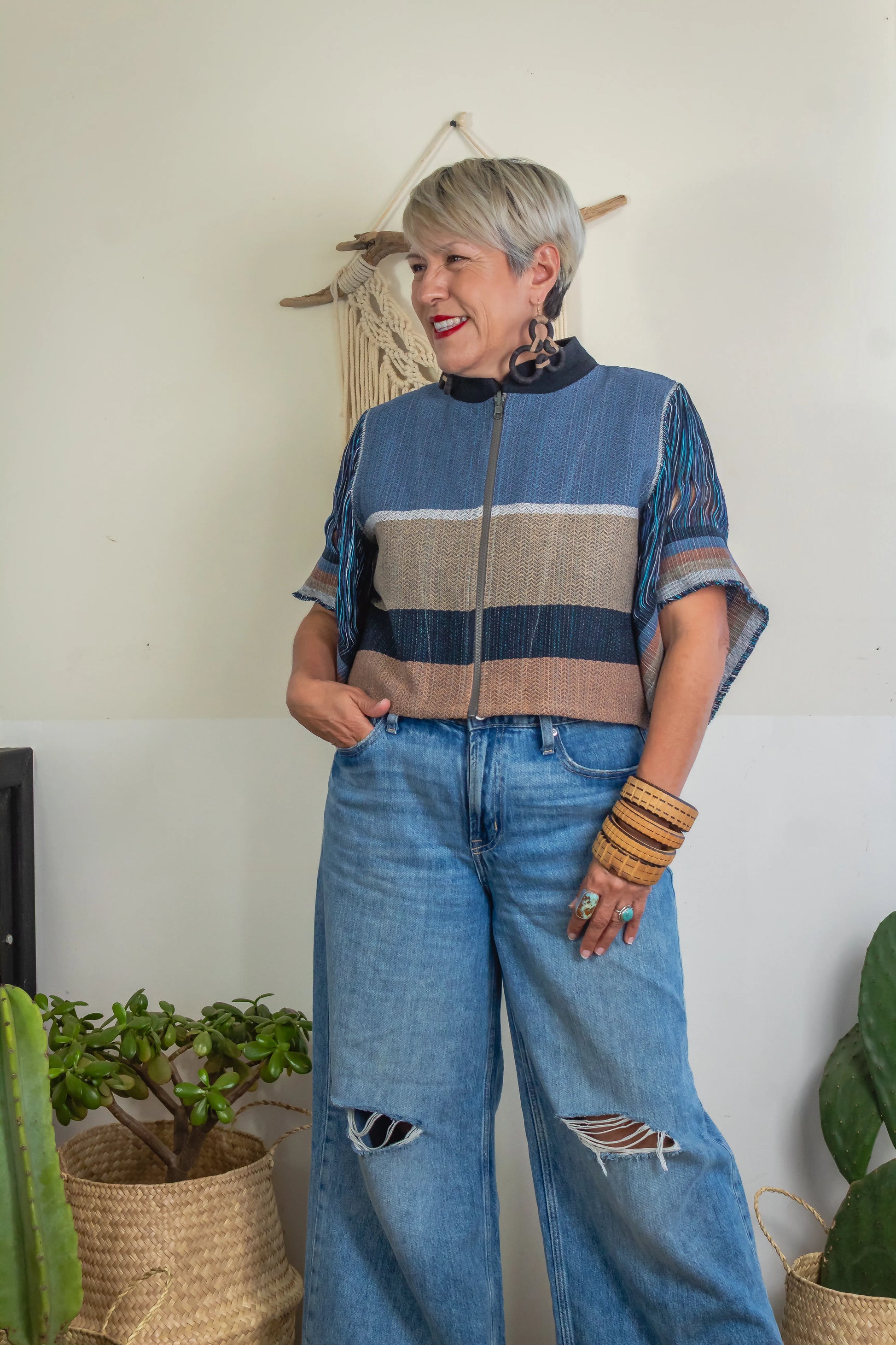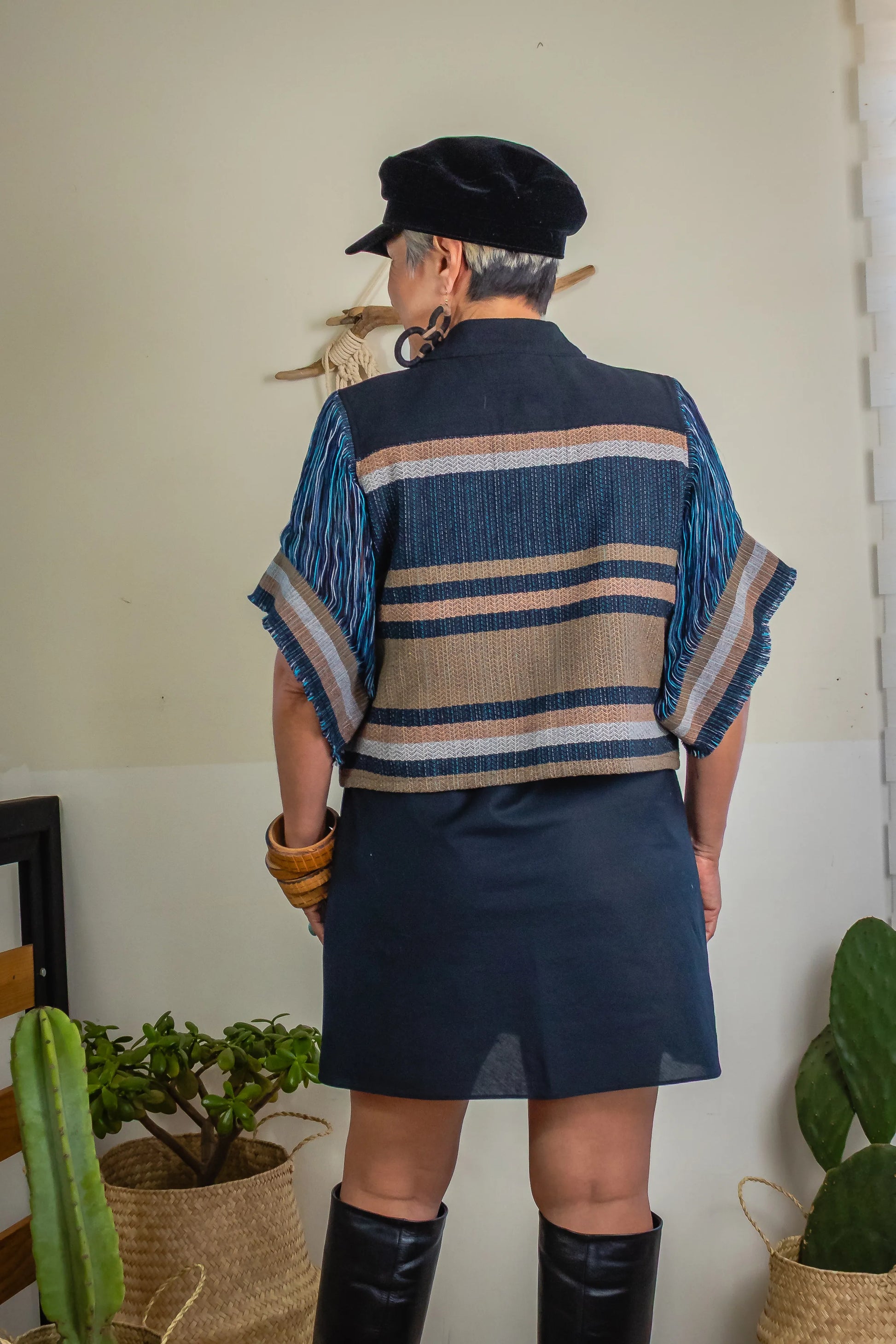 Descripción: Corta, con mangas en deshilado amplio y cierre al frente. Cuello tipo mao.